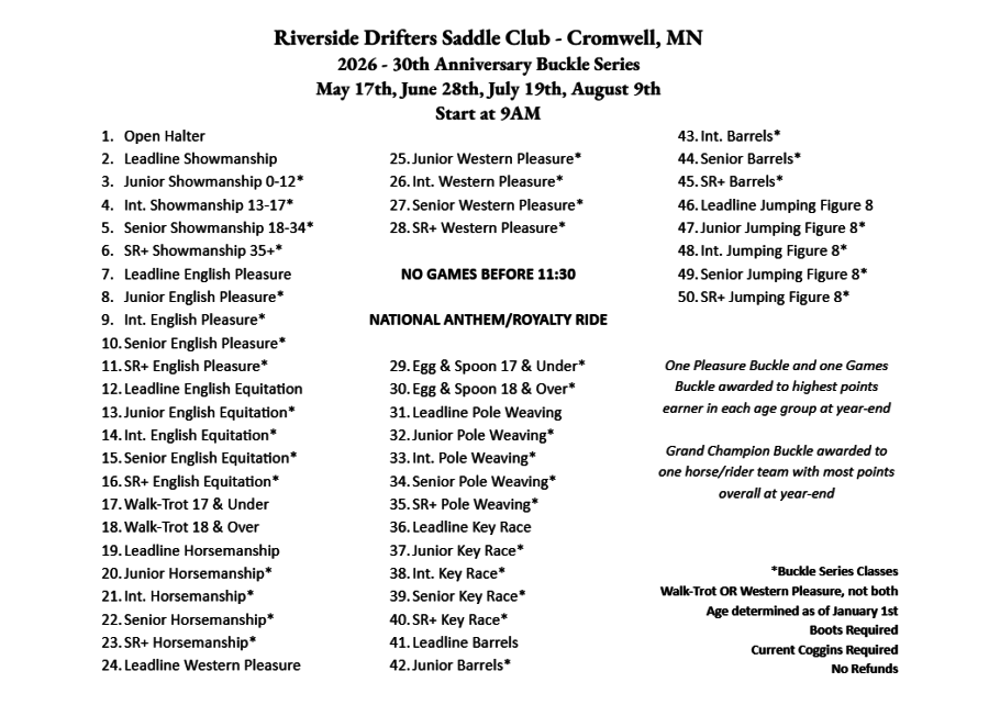 It is the policy of Riverside Drifters Saddle Club to provide its Members, their guests, and other members of the public, access to all of the club's facilities and activities without regard to a person's race, color, religion, sex, national origin, disability, age, ancestry, familial status, or military status.